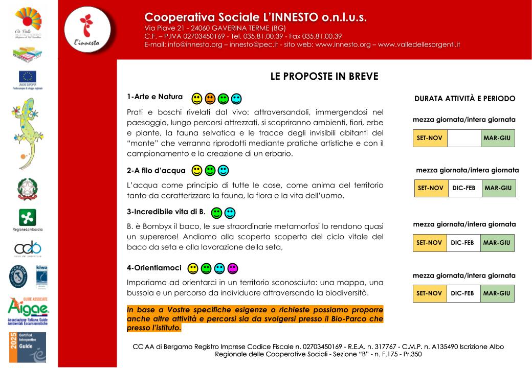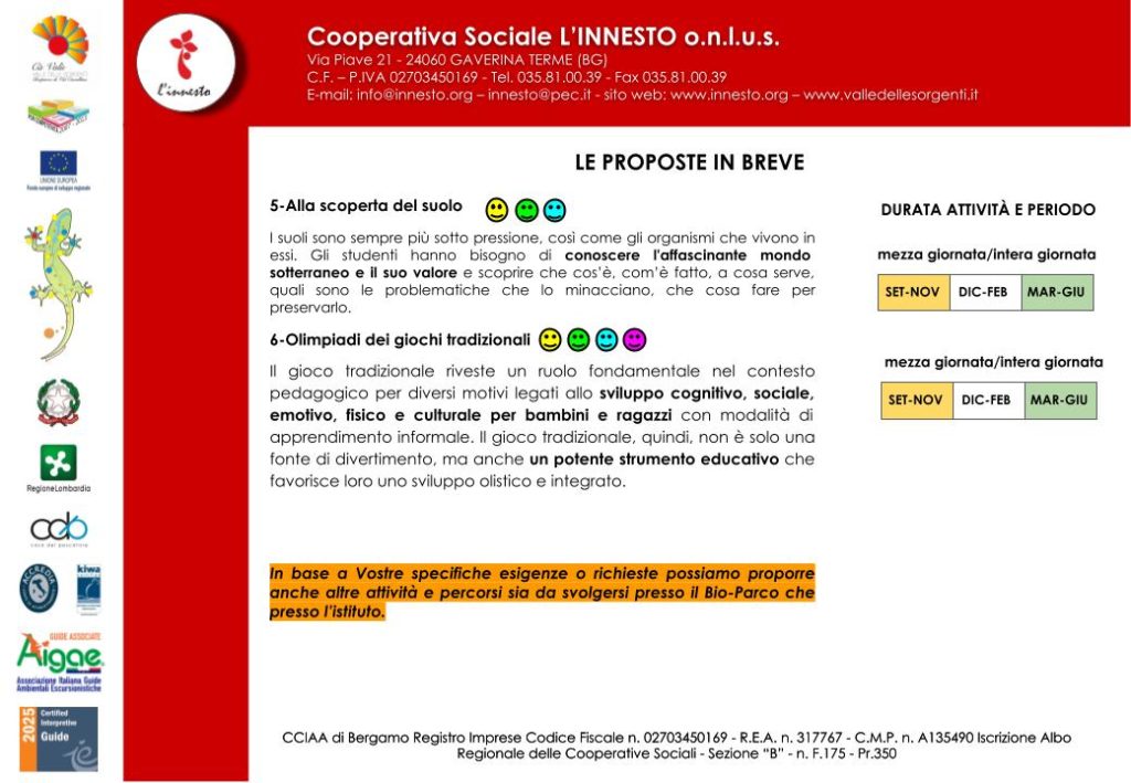 La Cooperativa L’INNESTO nella sua pluriennale esperienza per attività educative e ricreative, mette a disposizione operatori didattici professionali e accompagnatori in numero adeguato, spazi e tutto il materiale didattico necessario allo svolgimento delle attività.